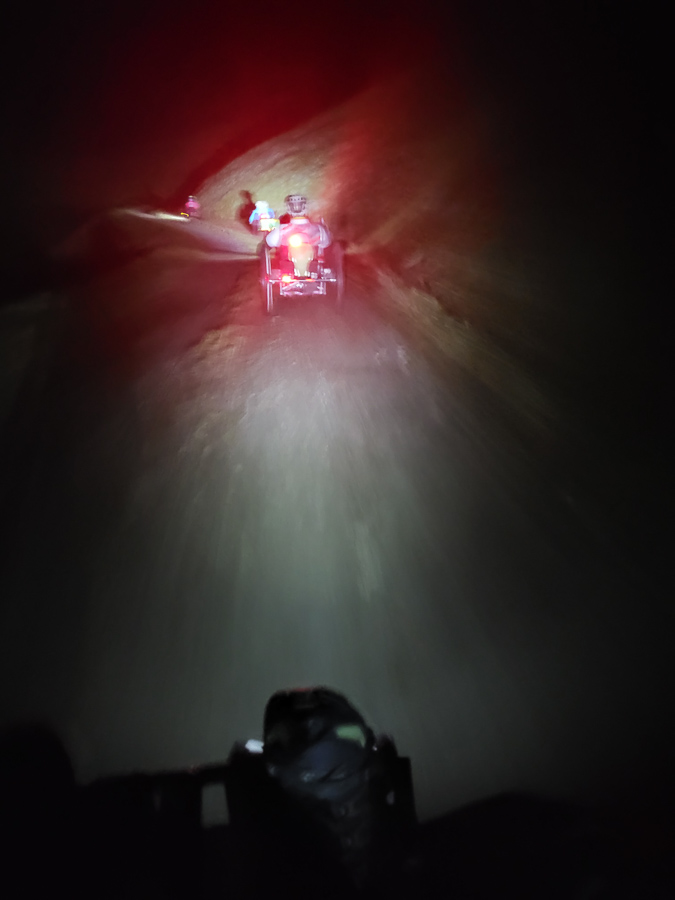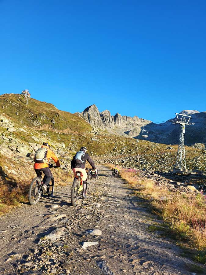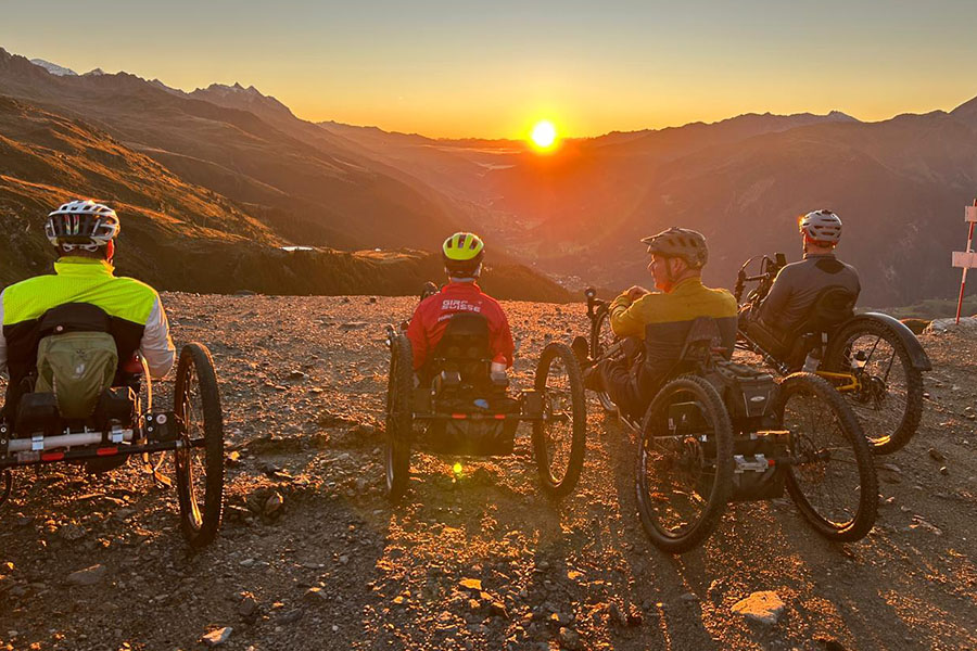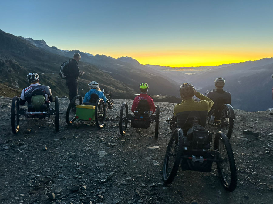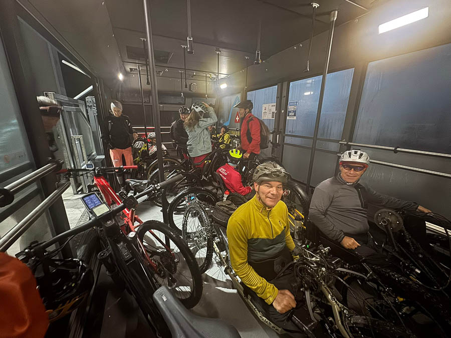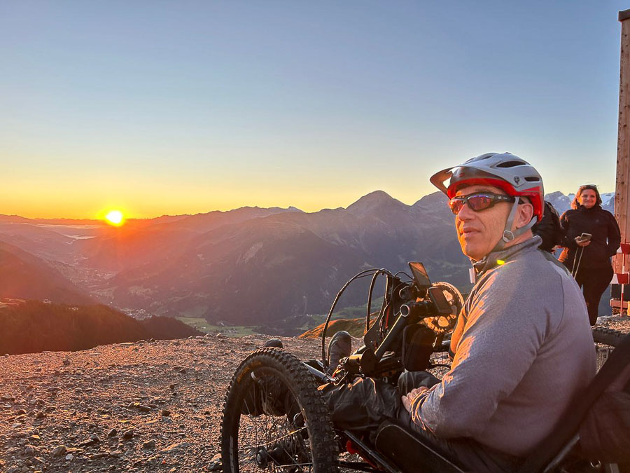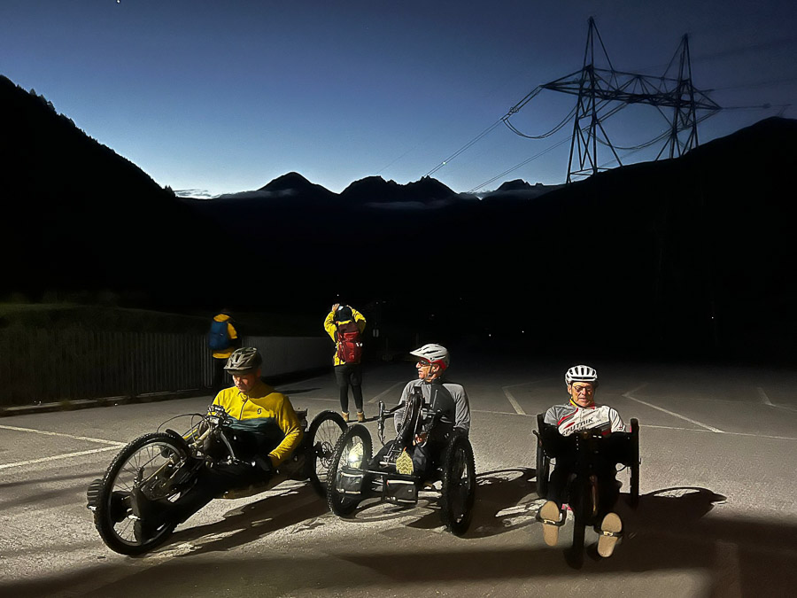 Noch in tiefer Dunkelheit starteten wir, mit diversen Lampen bewährt, beim Catrina Resort in Disentis. Auf meist angenehmen Kies- und Graspisten kurbelten wir bis zur Talstation der Cuolm da Vi Bergbahn in Sedrun. Dort wartete bereits die gebuchte Extrafahrt: Die geräumige Gondel bot locker Platz für fünf Handbikes und zehn Begleiter*innen mit ihren MTBs.