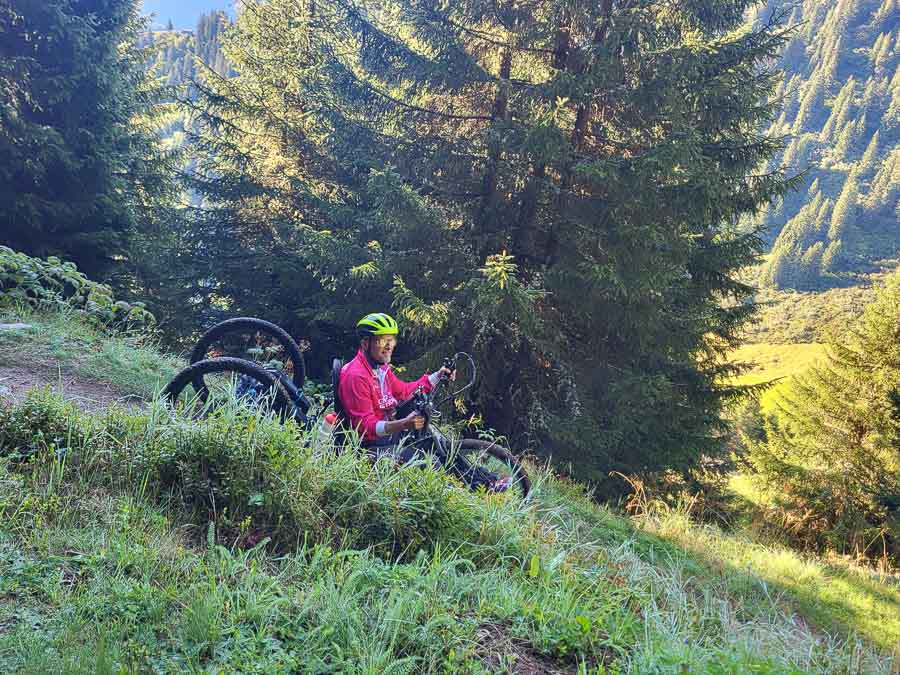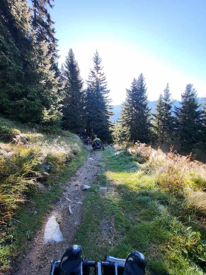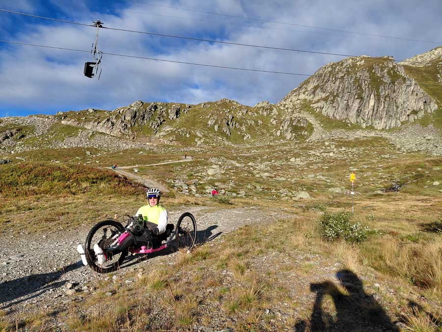 Von dort führte eine ruppige, felsige Abfahrt zur Bergstation der Caischavedra-Gendusas Sesselbahn. Hier beginnt der Catrina Flow Trail. Die ersten engen Kurven sind laut den einheimischen Guides für Handbikes ungeeignet, also stiegen Walti und ich etwas weiter unten ein – und genossen den Flow in vollen Zügen. Die anderen Handbiker*innen wählten die parallel verlaufende, nach wie vor ruppige und steil abfallende Flurstrasse. Wieder vereint waren wir bei der Bergstation der Disentis-Caischavedra Seilbahn.